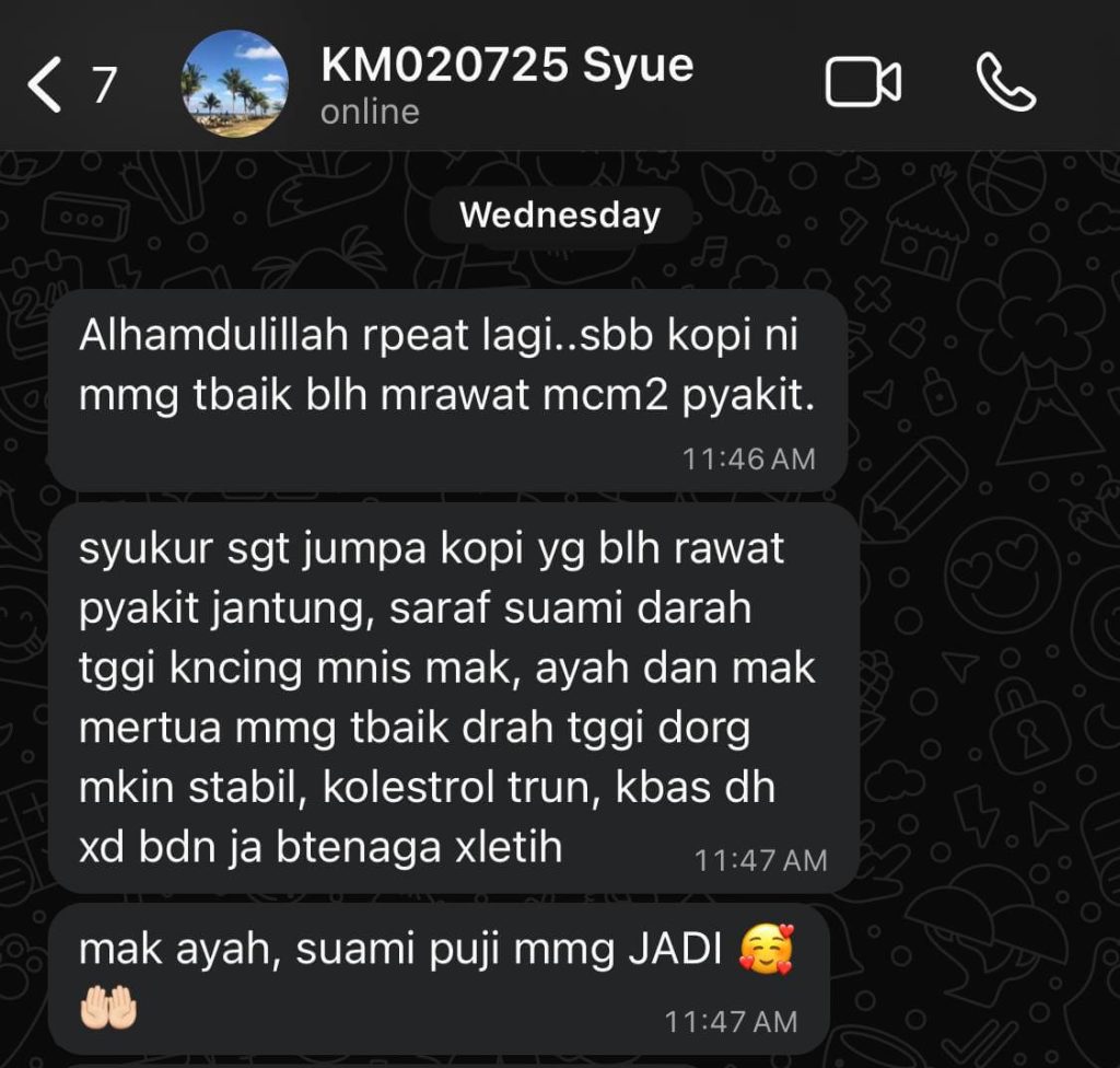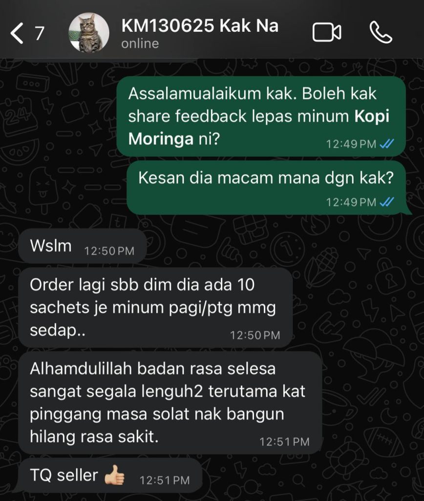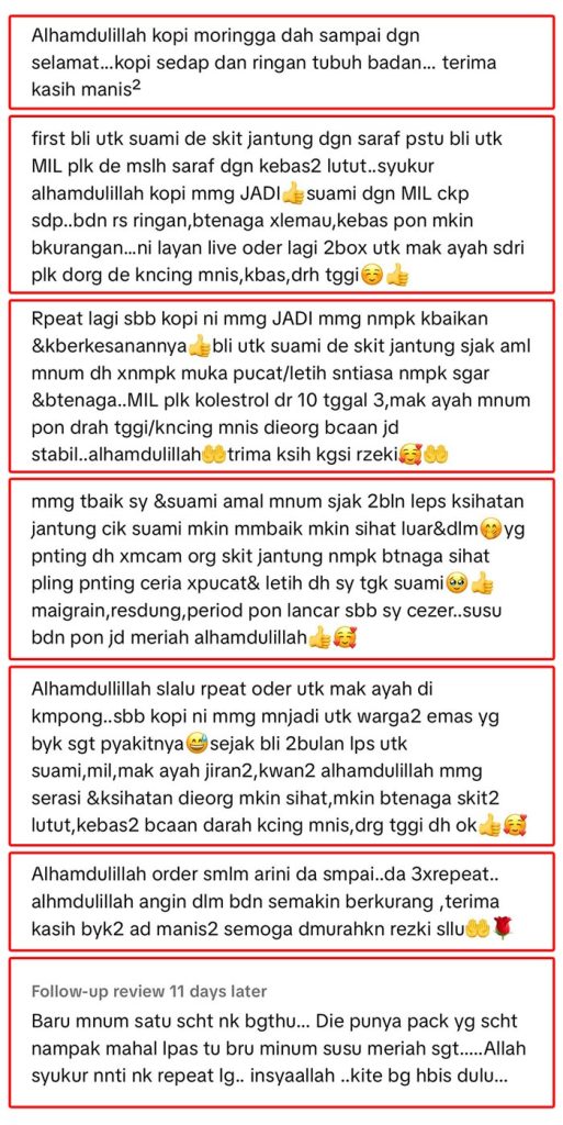 “Terbukti berkesan ! Dah ramai pengguna sembuh lepas amalkan Kopi Moringa. Bacaan gula makin okay, tekanan darah dah stabil, hilang rasa kebas2 & badan makin bertenaga.“
