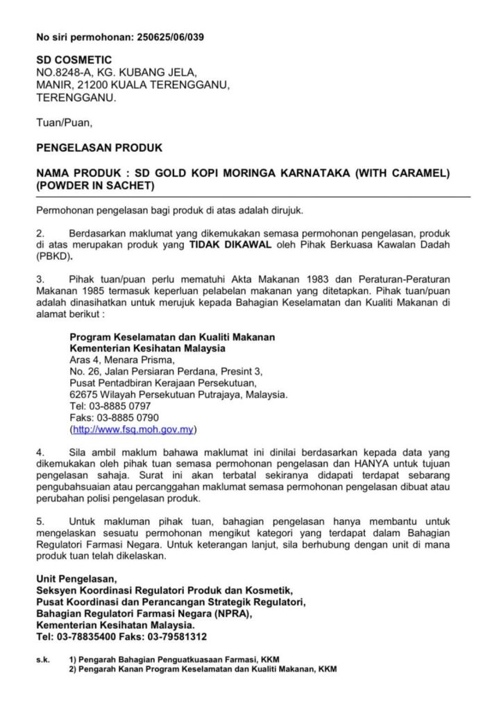 Kopi Moringa telah mendapat kelulusan dari KKM